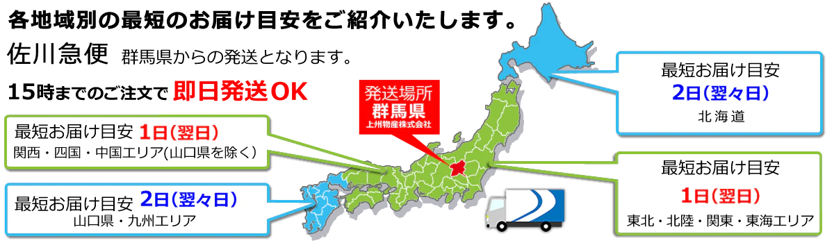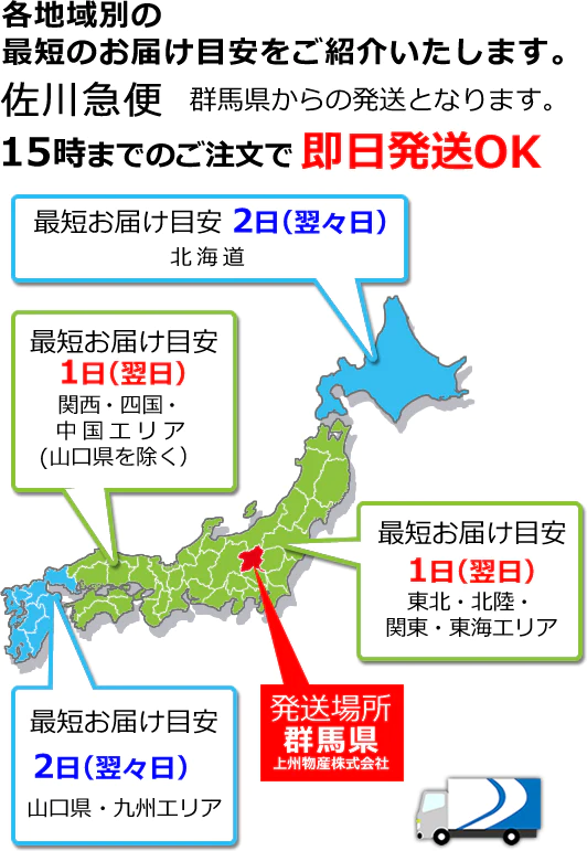 お届けは佐川急便になります。伝票番号をご予約時にお伝えしますので、事前に佐川急便の営業所に問い合わせていただく事でドライバーと直接お話しをしていただき大体の到着時間を知ることが出来ますので貴重な時間を有効に使うことが出来ます。