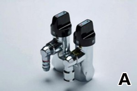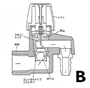 お客様が用意したプロパンガスボンベには通常下写真Aの様なガスコックが付いていますが、このガスコックの中には下図Bの様な安全装置が付いています。(過大な流量のガスが流れるとボールが押し上げられてガスを遮断します。ラムネの瓶のビー玉をイメージしてください)