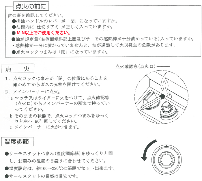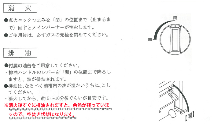※位置がズレていますと、正しい温度管理が出来ません。 - 排油ハンドルのレバーが「閉」になっていることを確かめてから、油槽に油を入れてください。