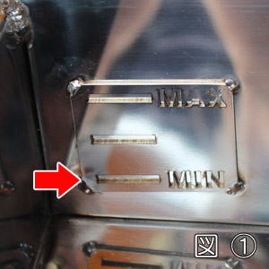 点火して油温が180℃になりますと、油が膨張してだいたいMINとMAXの間の位置(下図②)になります。