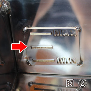点火して油温が180℃になりますと、油が膨張してだいたいMINとMAXの間の位置(下図②)になります。